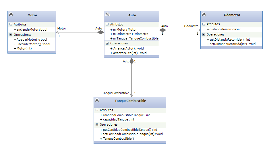 Veamos un ejemplo utilizando la clase Auto, el siguiente diagrama de clases de UML (Unified Modeling Language) muestra como dicha clase esta compuesta por las clases Motor, Odometro y TanqueCombustible.